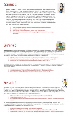 * 2. Scenarios We provided 3 scenarios of typical issues that students can come across with during their studies (see above - Focus Group 1 - Scenarios and Personas). They were asked how they could overcome those presented issues by means of an app with the focus on asked questions (see above in "Focus Group 1 - Scenarios)