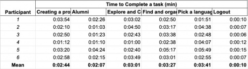 The most time was taken to complete the task of Picking a language partner and the least amount of time was taken for Connecting with an Alumni.This time taken was also confirmed by the qualitative evaluation where users has been asked about the complexity of the tasks and most of our users rated the language to be the most complex task which might have been the reason for the maximum time taken.