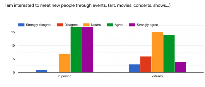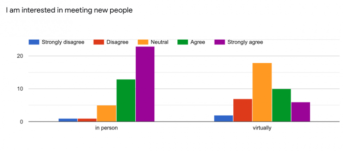 - The majority of participants strongly agree to meet new people in person. Moreover, the majority of participants responded as neutral to meeting new people virtually.