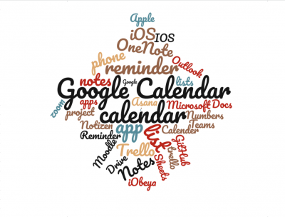 • 64 responses • 32 (50%) do not use organizational apps for university work • 31 (49%) use organizational apps for university work • Most used digital platform: Calendar • Most important feature: Reminders • Recurrent analogue technique: paper and notebook