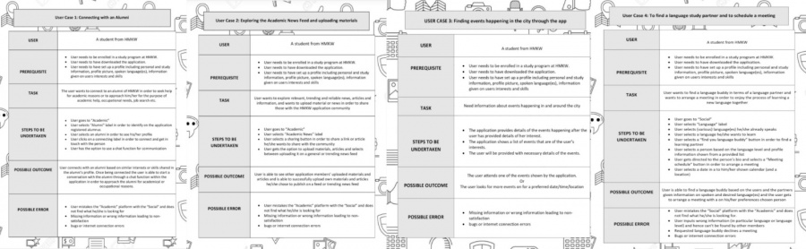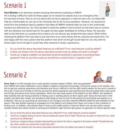 We provided 2 scenarios of typical and possible issues in particular for the academic and the alumni section of our platform that students can come across with during their studies. They were asked how they could overcome those presented issues by means of our app and the features we had already provided.